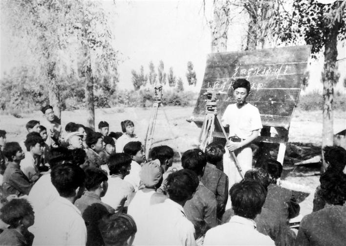 建校初期,田野当课堂,师生们在胡杨树下上课。