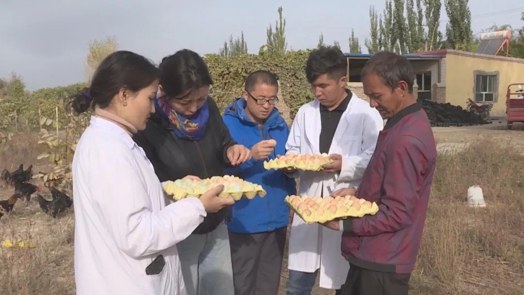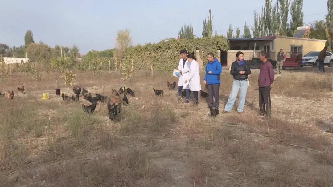 格明古丽•木哈台说(图右二),一开始农民们都不愿意养鸡,觉得鸡不好养且养殖效益不高,最后就剩下了吐尔洪•伊斯坎迪尔一家愿意试一试。为了打开这个致富通道,格明古丽•木哈台隔三差五就要带着团队人员过来查看。