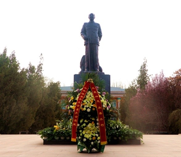 最后,干部和师生代表依次走石阶,将手中的鲜花,摆放在王震将军铜像前,缓步绕行瞻仰革命先烈的光辉形象。