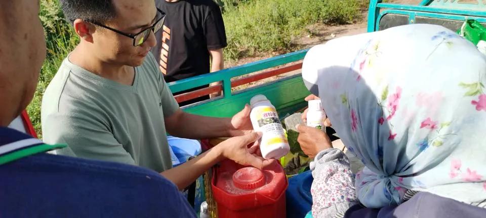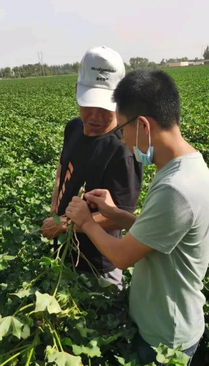 在本次活动中,团队成员通过线上线下两种调查问卷的形式了解农民对棉花病虫害防治。指导老师带领团队成员到棉花地进行观察棉花病虫害、田间杂草、棉花打顶,以及给农民认真讲述棉花常见的病虫以及农药化学用量要适宜的处理措施,并且时刻关注棉花地生长情况,在不同时期根据不同情况进行不同用药。