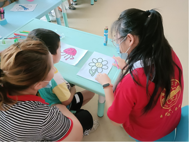 在该主题活动中,孩子们用不同颜色的画笔画出了自己眼中的事物,或是遇见自己从未见过的事物,不知道怎么下手的时候,学生志愿者们就会帮助他们完成画作。