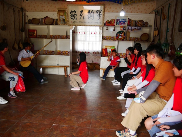 新和县加依村是传承发扬古代龟兹文化和维吾尔民间文化的典型代表,加依村制作乐器的历史悠久,早在300年前,农民就边从事生产,边制作乐器。现全村215户村民有105户从事乐器制作。在加依村讲解员的带领下,同学们进入加依村龟兹文化乐器展示中心,先后参观了中心展示展厅,乐器制作展厅共两个展厅。中心展示厅内陈列着100多件新疆各民族各时期乐器。团队成员在此对于龟兹乐舞的历史及新疆少数民族传统乐器制作有了初步的了解。
