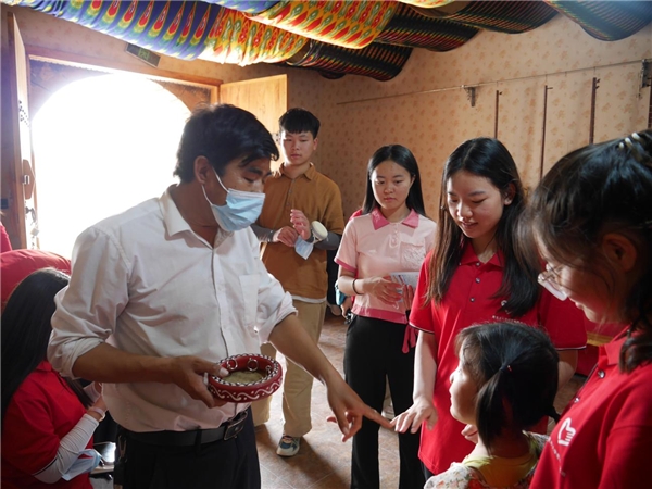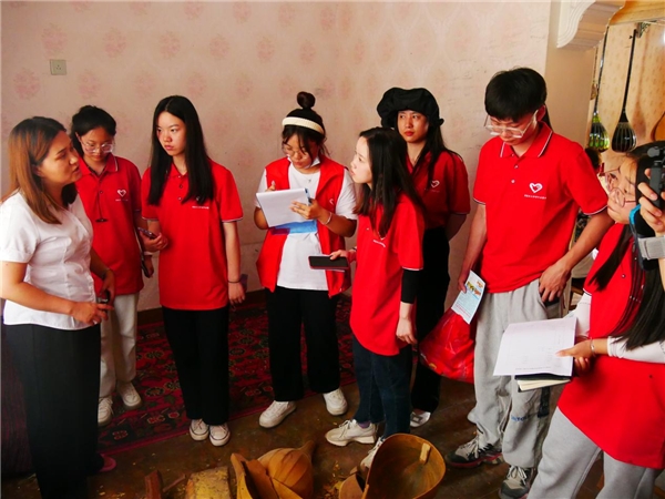 图为团队成员向加依村讲解员了解乐器制作过程。中国青年网通讯员 王泳琪 摄