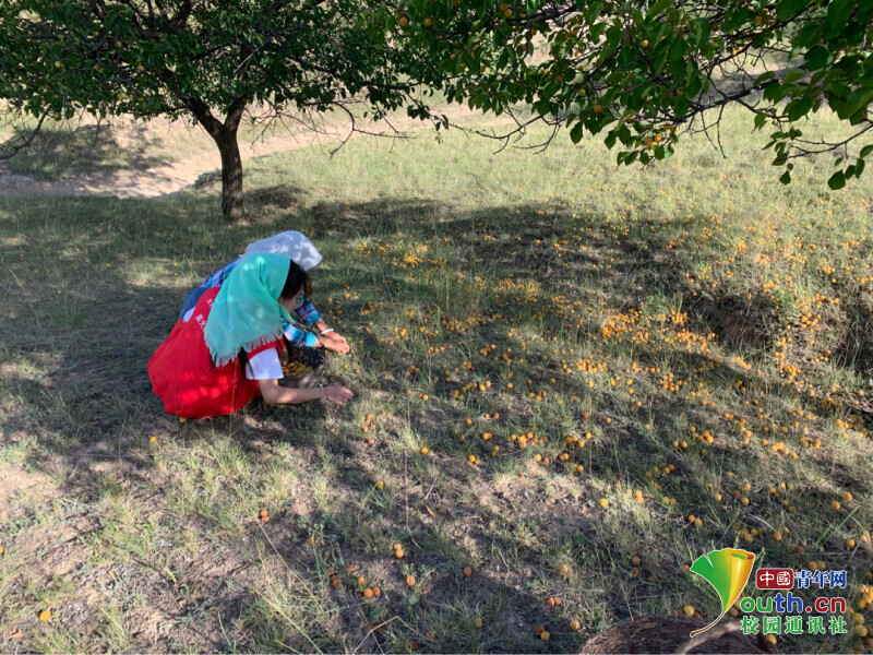 图为团队成员帮助村民拾捡杏子。中国青年网通讯员 李明霞 供图