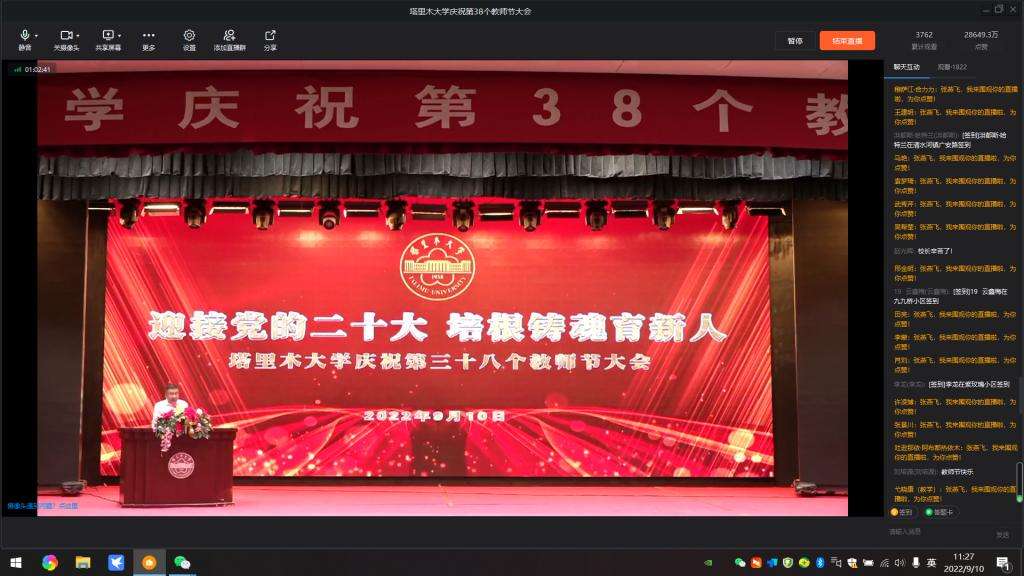 金秋溢彩,桃李芬芳。9月10日上午,伴随着雄壮的奏唱国歌声,塔里木大学“喜迎党的二十大 培根铸魂育新人”庆祝第三十八个教师节大会拉开帷幕。
