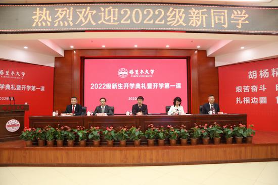 中新网兵团新闻9月13日电(郑亮)金秋九月,秋风送爽。9月12日,塔里木大学隆重举行2022级新生开学典礼暨开学第一课大会。全体2022级塔大新生怀揣着青春梦想,“云端”汇聚,在这里开启人生新的征程。塔里木大学党委书记赵光辉,塔里木大学党委副书记、校长张爱萍出席典礼并讲话。