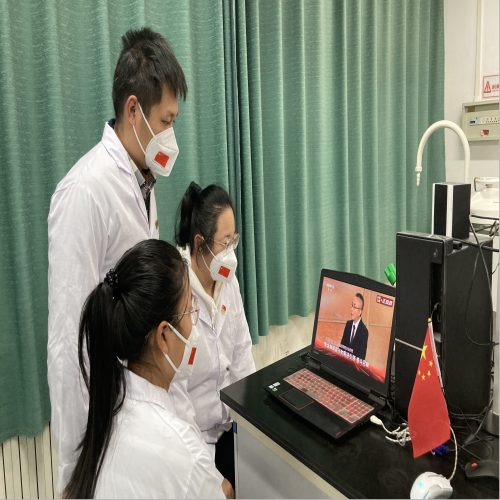 校医院刘永君医生当值负责采集核酸,在完成工作任务后,第一时间观看了开幕会盛况,并和大家交流收看感想。“我要牢记初心使命,立足工作岗位实际,勇当学校公共安全卫生的护佑‘先锋’,全力守护好广大师生员工的身体健康和生命安全。”