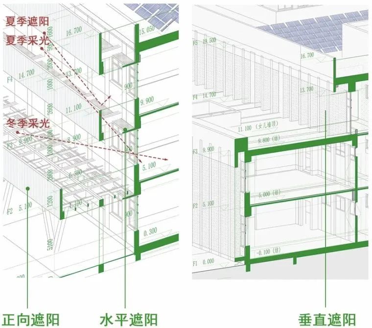 与结构一体的外遮阳花格梁,形成室内外之间的过渡空间,经过周密的构件设计,确保夏季遮挡强烈日照,冬季又能让太阳光直射进室内。