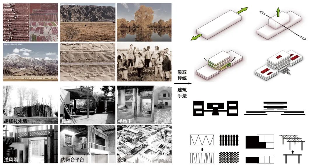 设计向适应南疆气候的传统民居学习,并将传统元素进行了现代转译,提炼出遮阳、通风、有遮蔽的露台、地下半地下空间等传统建筑智慧。