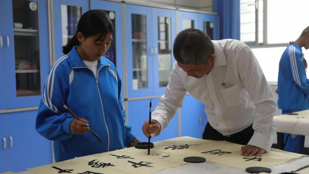十四师一牧场中学老师教学生练习毛笔字。十四师昆玉市融媒体中心记者 钟昌涛 摄