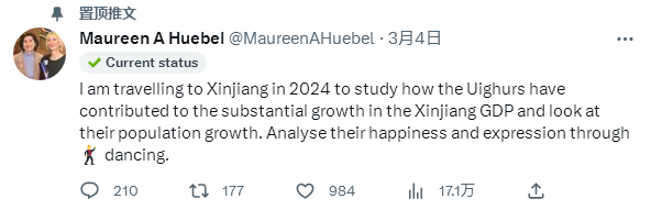 然而,对中国有一定了解的休伯尔对所谓“新疆存在种族灭绝”等说法表示质疑,她为此专门开设推特账号,了解、研究、分享有关新疆的真实情况。