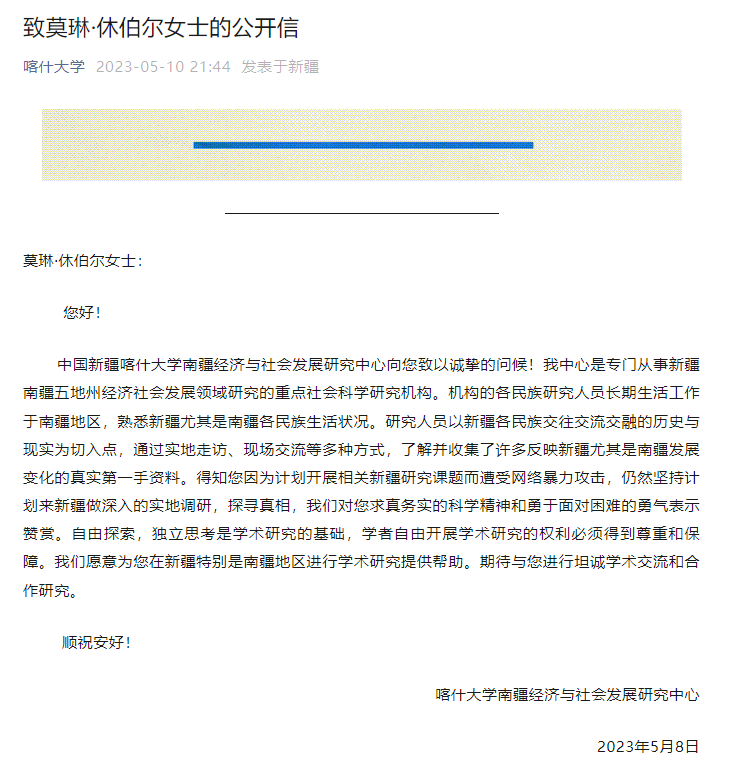 此前,希望了解新疆真实情况的休伯尔在社交媒体宣布将于2024年赴疆,她因此遭到网络暴力、账号被封、学术合作受阻等问题。许多人指责她是“假账号”、“宣传工具”和“机器人”,甚至向她发出死亡威胁。