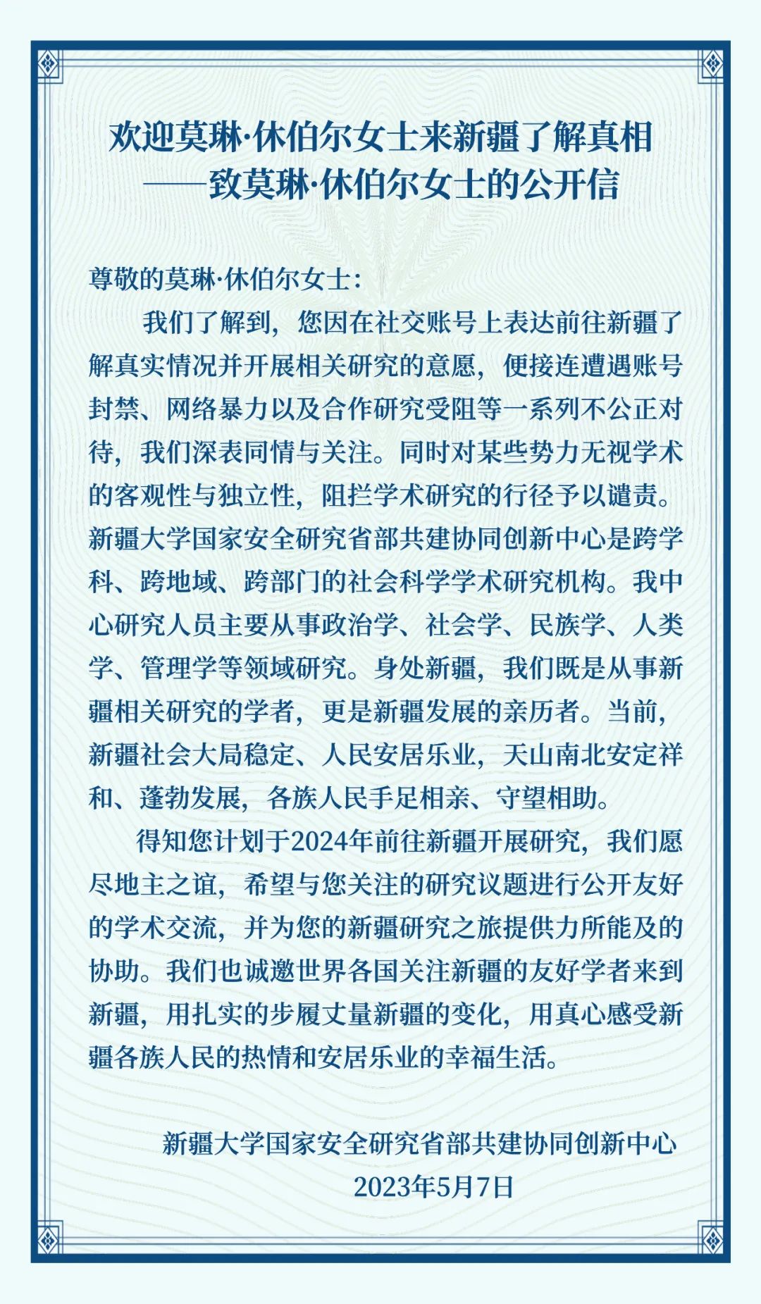 同时,西南政法大学人权研究院、西北政法大学国家安全学院、兰州大学中亚研究所、新疆大学国家安全研究协同创新中心、新疆师范大学民族与社会高等研究院、塔里木大学、伊犁师范大学“一带一路”发展研究院、石河子大学区域国别研究中心、喀什大学南疆经济与社会发展研究中心也纷纷发布消息,表示“欢迎莫琳·休伯尔女士来新疆”。