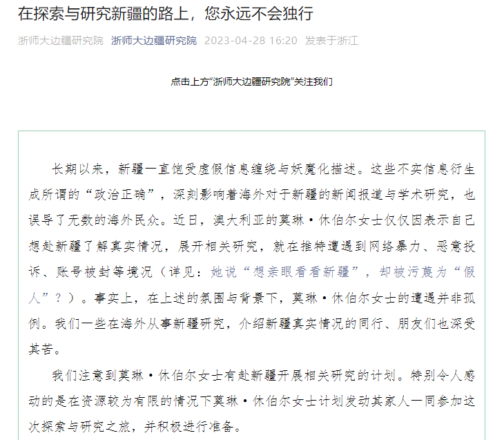 We have noticed Ms Huebel's research plan to go to the Xinjiang region and as an academic institute which has studied the region for a long time, the Institute of China's Borderland Studies at Zhejiang Normal University, is willing to offer assistance. "On the journey of exploring and researching Xinjiang, you never walk alone," read the notice of the institute.