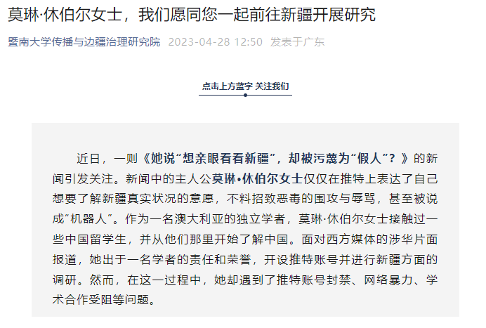 暨南大学传播与边疆治理研究院表示,近些年,一些西方国家出于意识形态偏见和地缘政治战略需要,以人权为借口大肆炒作所谓新疆“种族灭绝”“强迫劳动”等议题。在国际上,一些反华媒体和政客造谣生事,中国学者的正义声音长期被打压和忽视,更遑论与国外学者开展合作研究。对于莫琳·休伯尔女士的遭遇,我们感同身受。