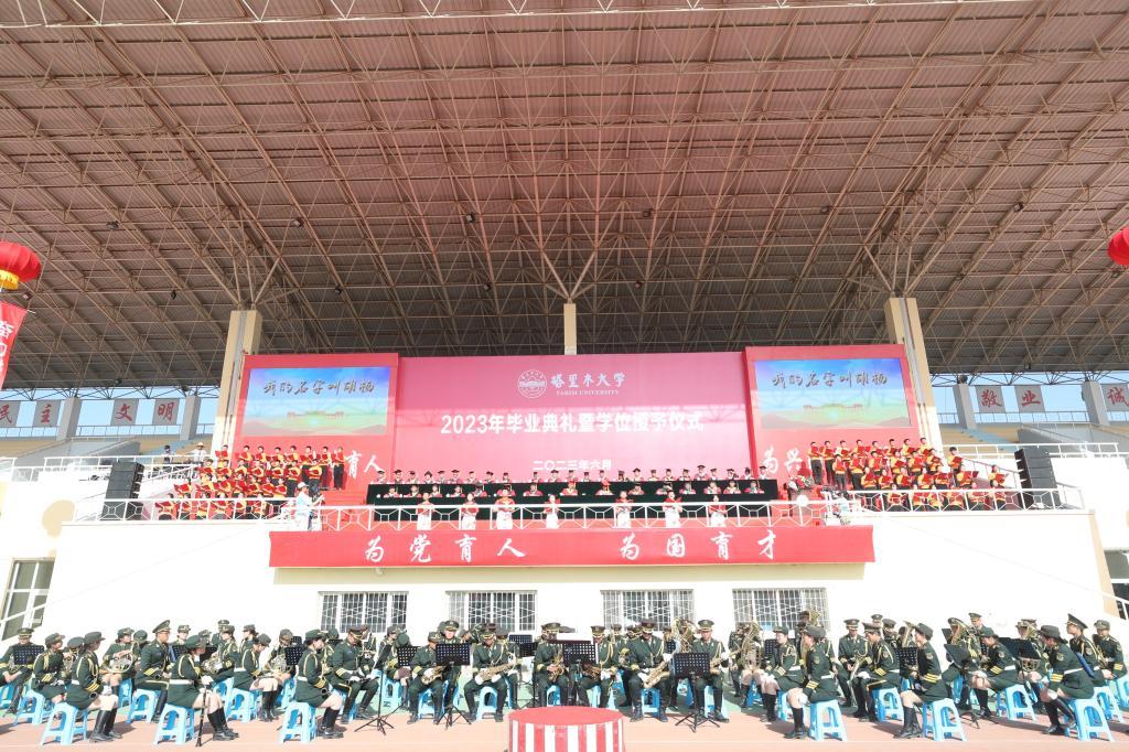 上午9时,伴随着庄严的升国旗仪式、嘹亮的奏唱国歌声和军乐团演奏声,塔里木大学2023年毕业典礼暨学位授予仪式拉开帷幕。