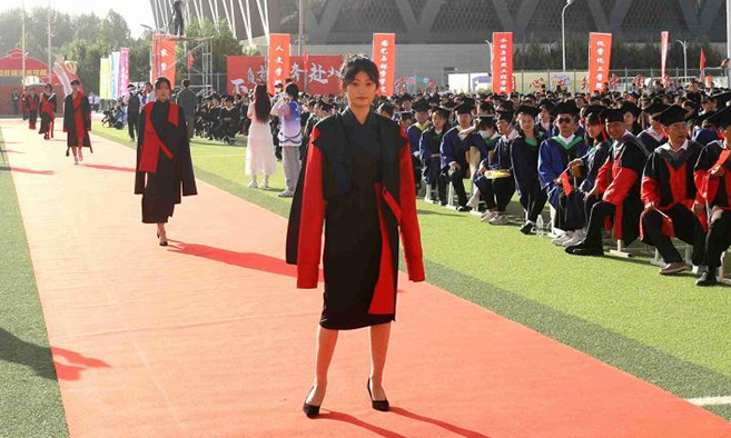 一大早,毕业生们身着毕业服、头戴毕业帽,陆续通过送别路和毕业门,走进塔里木大学西区运动场、走进毕业典礼现场。来自人文学院服装与服饰设计专业的学生们,展示了服装设计实践课作品。