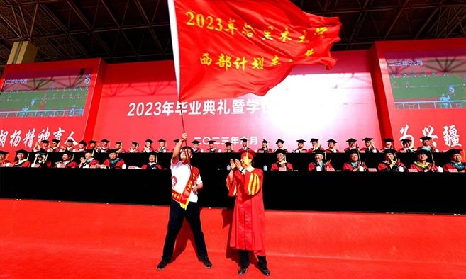 与会校领导为2023届博士研究生、硕士研究生、本科毕业生代表颁发了毕业证书,为兵团级优秀毕业生、校级优秀毕业研究生、校级本科优秀毕业生代表颁发了荣誉证书,为“西部计划”志愿者出征授旗。