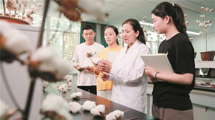 2022年10月27日,“棉花公主”万素梅教授(右二)指导学生做棉花试验。
