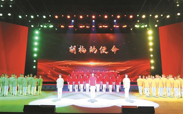 10月4日晚,塔里木大学举行庆祝建校65周年文艺演出,演员们表演思政精品舞台剧《我是一棵胡杨》。