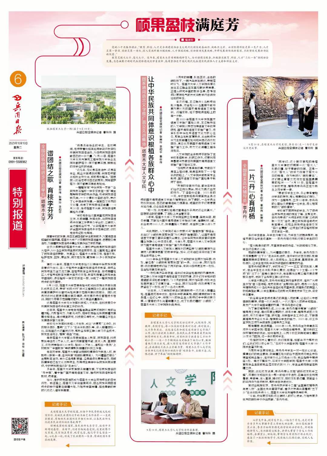 与此同时,人文学院还将乡村振兴与“推普扶智”相结合,派出以“小胡杨教育帮扶团”为代表的“推普团队”,让国家通用语言文字普及意识深植天山南北,让中华民族共同体意识在新疆各族群众心中深深扎根。今年5月,塔里木大学人文学院被评为国家通用语言文字推广普及先进集体。