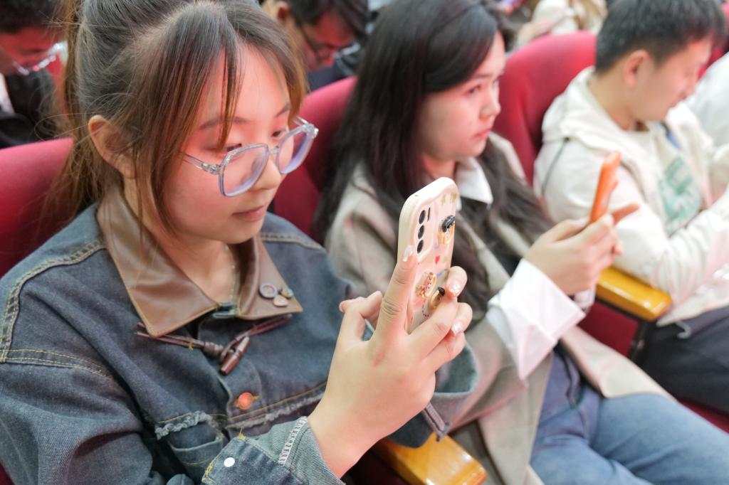 观影结束后,师生们纷纷拿起手机朝向LED大屏扫码答题,积极参与影片点映测评。