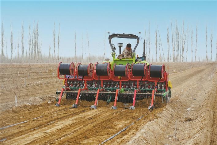 3月17日,十四师二二五团三连西梅地里,播种机在作业。近期,二二五团农业发展服务中心做好农机检修、维护工作;对接合作社和农资店,确保种子、肥料、农药、农膜等农资供应;组建农业技术服务队伍,深入田间地头,为职工群众解决农业生产中遇到的问题,助力春耕春播。陈阳阳 摄