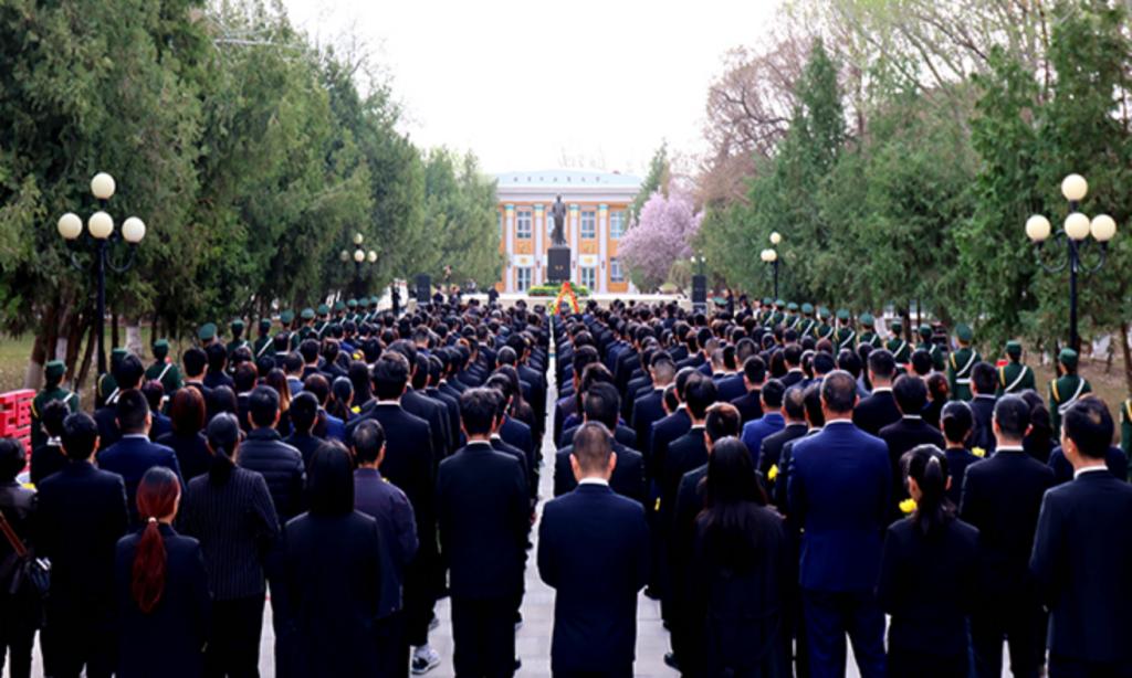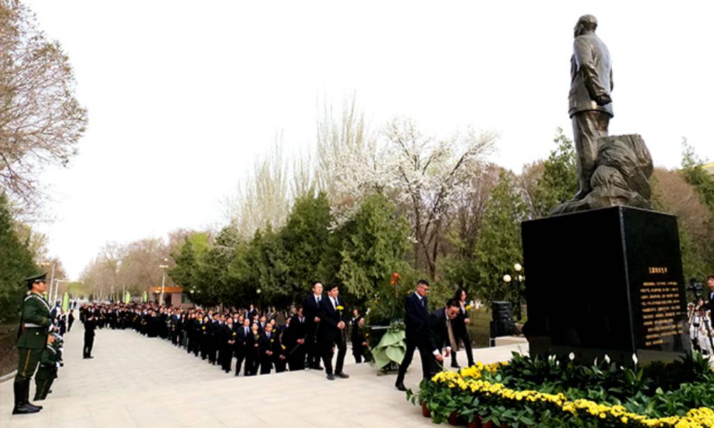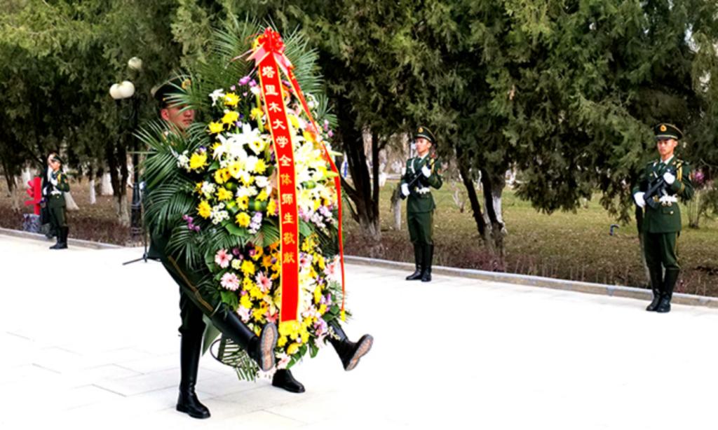 阿拉尔讯 4月4日上午,塔里木大学向王震将军铜像敬献花篮仪式在红色文化广场举行。