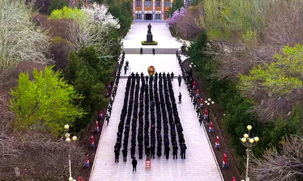在春日晨光的映衬下,王震将军铜像巍然耸立,广场两旁松柏傲然挺立。铜像基座上白菊等鲜花,寄托着全体塔大党员干部和师生员工对革命烈士的无限敬仰和缅怀之情。