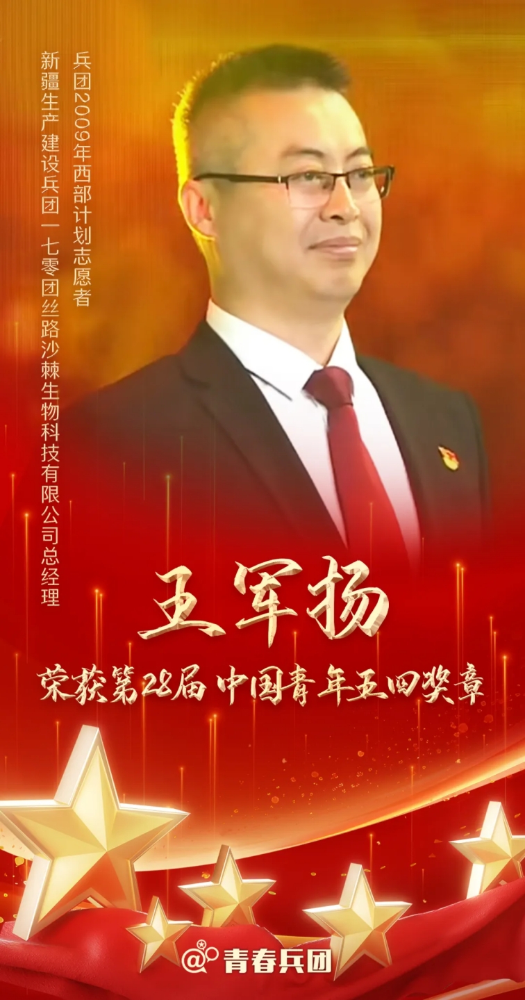 2009年塔里木大学毕业后,王军扬决定报名参加大学生志愿服务西部计划,主动选择来到兵团第九师最艰苦,也是兵团三十二个少数民族聚集贫困边境团场之一的170团。170团坐落于山地丘陵、荒漠戈壁之上,地处风头水尾,耕地稀缺,土壤贫瘠。没有大自然赋予的地理环境优势,致富之路更显艰难。作为在兵团精神耳濡目染下成长的兵三代,王军扬的心里一直有一个愿望,那就是学有所成之时,回到团场,像他的父辈们一样,建设团场、戍卫边疆,带领家乡的职工群众增收致富。在王军扬的带领下,依托沙棘产业,合作社167户职工年均收入从2019年的4.5万元增长至2023年的12万元,增长了近3倍。沙棘成为170团职工增收致富的“金豆子”。