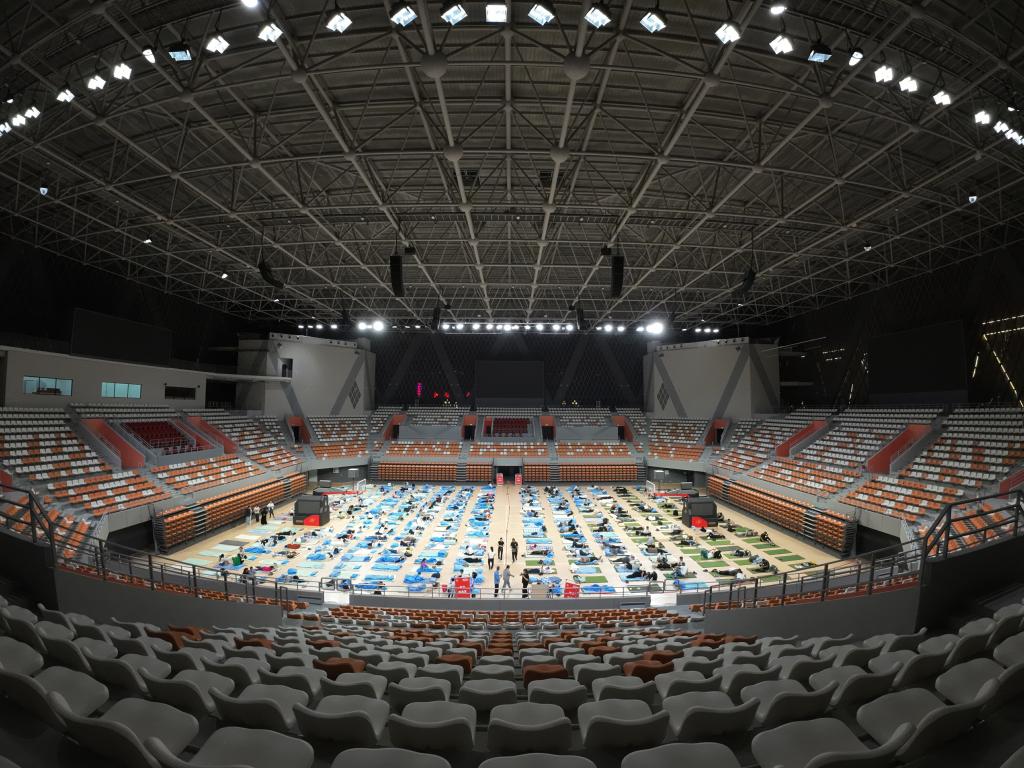 9月6日夜,塔里木大学体育馆内,数百名家长准备在此就寝。新生入学之际,该校在学校大型馆所安置500张床位,提供给陪同新生报到的家长们。(兵团日报全媒体记者 王志清)