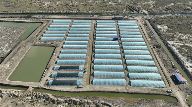 ▲航拍十四团水产养殖基地。一师阿拉尔市党委宣传部供图“2023年,我们通过招商引资引入水产企业发展盐碱水水产养殖,试验养殖鲈鱼、南美白对虾等,实现水产养殖从无到有。”十四团农发中心工作人员曹静洁说。