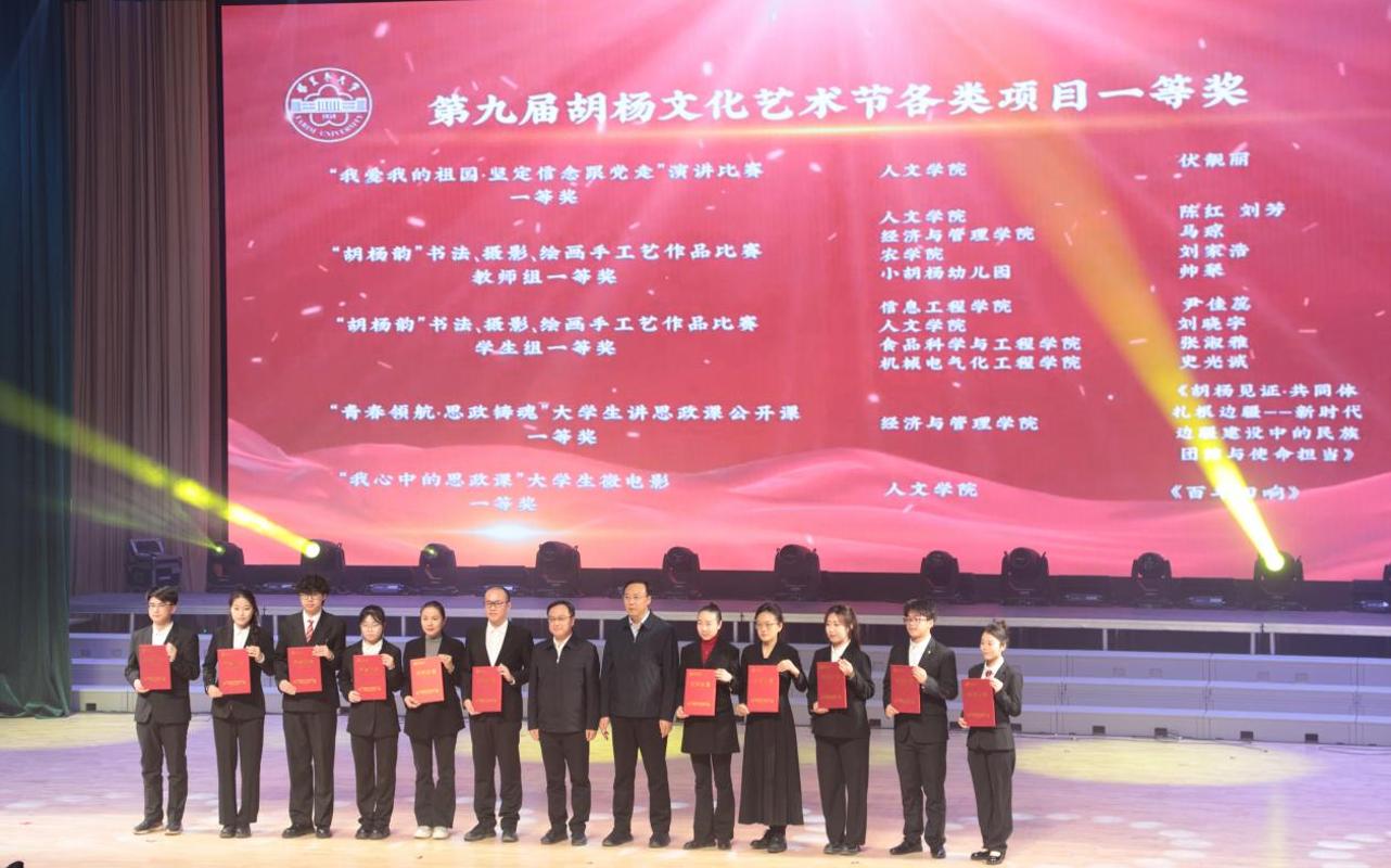 在第二篇章“胡杨·礼赞——艺韵流光 精神传承”中,学校依次为在胡杨文化艺术节中获得集体及个人项目一等奖、“三下乡”优秀组织奖、艺术节优秀组织奖获得者颁奖,其间穿插的舞蹈《石榴花开幸福来》《四季·二十四节气》,融合了民族情谊与传统文化。