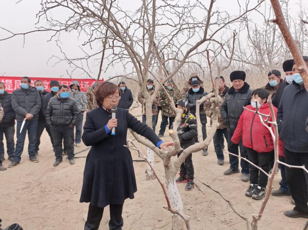 吴翠云教授在10连枣树地开展现场培训。重点培训以下内容:一是树种统一、疏密改造、增施有机肥面积、喷施石硫合剂、林下经济种植面积等5个方面;二是实行提质增效这一举措的原因;三是如何具体实施提质增效工作,如疏密改造后充分利用生长空间而进行的修剪工作;还就当地职工提出的问题进行解答。
