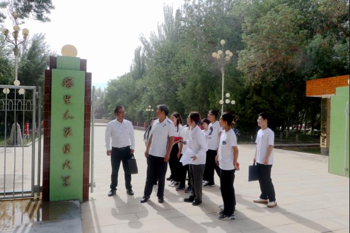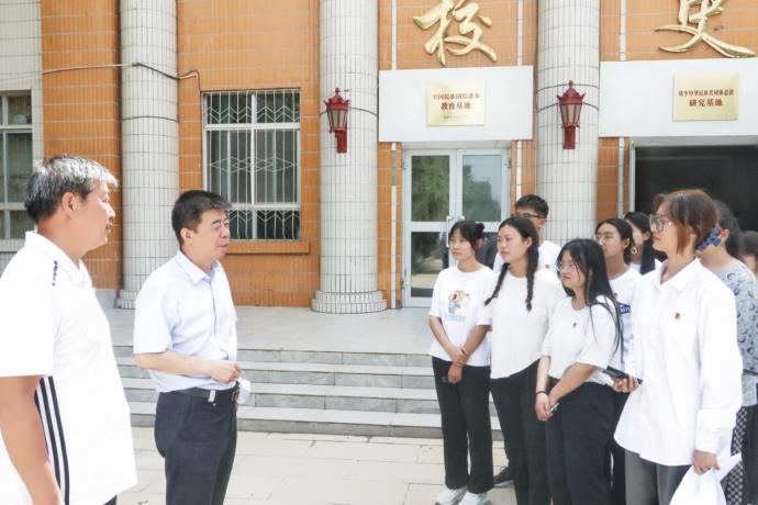 在校史馆门前,看见团队师生们在倾听王合理教授讲述校史时,党委书记赵光辉上前同王合理教授、团队师生们亲切交谈了起来。叮嘱师生们要珍惜这个宝贵的机会,多多向老领导老教授请教学习,赓续红色血脉,传承红色基因,发扬优良作风,继承优良传统,践行胡杨精神,争做爱国爱疆、担当奉献、扎根边疆、献身边疆的堪当民族复兴重任的新时代戍边人,在青春的赛道上奋力跑出最好成绩,让胡杨种子、青春之花洒满南疆大地。