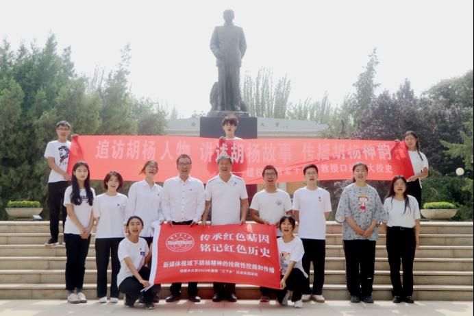 访谈结束后,团队全体成员围着王合理教授,先后来到建校初期老校门、红色文化广场、王震将军铜像、校史馆,耐心聆听王合理教授讲述学校的峥嵘岁月和自己的心路历程。