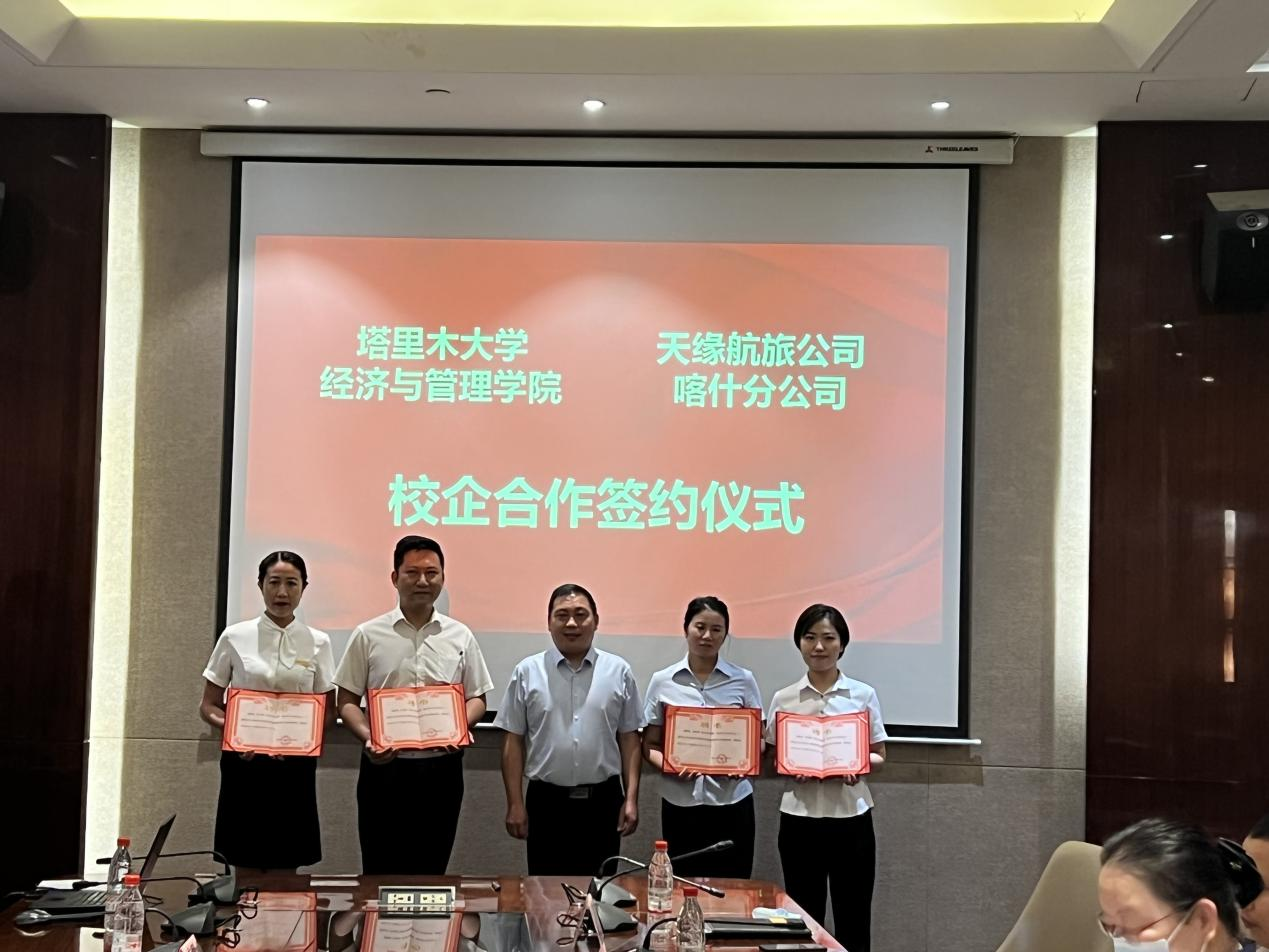蒋志辉、张青伟分别代表校企双方签订了旅游管理专业合作共建协议,为“塔里木大学校企合作基地”揭牌,蒋志辉向喀什机场贵宾部张雪薇、航食业务部汪旭东、喀什天缘国际酒店安全服务部龙燕君和行政人事部乔阳歌颁发了经济与管理学院旅游管理专业兼职教师聘书。(文/摄:马丽霞)