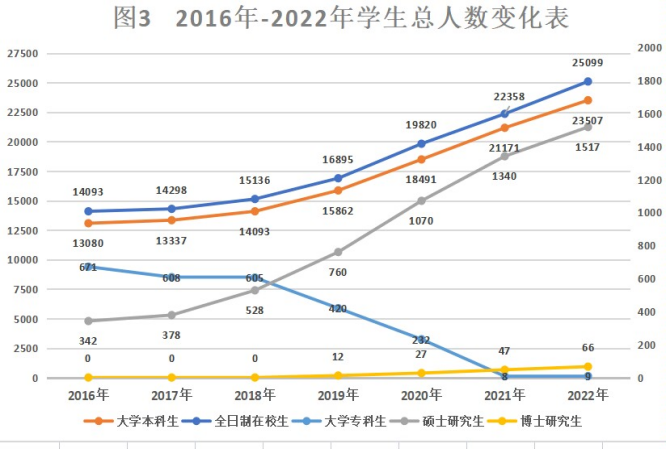 过去的十年,是塔大统筹扩大办学规模与高质量发展的十年。截止2021年底,学校现有教职工1425人,较2012年增加319人,增长28.84%;专任教师1046人,较2012年增加233人,增长28.65%,师资总量持续增长。2012年面向全国招生省市区20个,投放本科招生计划3050人,扩大到2022年面向全国31个省市区,投放本科招生计划7115人,增长率达到133.28%。2022年学校各级各类在籍在校生数达到25099人,其中本、专科23516人,硕、博研究生1583人,2012年13853人,增加11246人,增长81%,十年来共培养本、专科毕业生30909人。在兵团和相关部门的大力支持下,学校加大力度搭建特色研究平台,学校现有省部级以上科研平台21个,其中国家级4个,省部级17个。