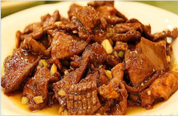 所谓三样,既猪里脊、猪肝与猪腰。三样洗净切片,辅以盐、胡椒粉等佐料,出锅后的老爆三色泽红亮,口味咸甜,蒜香味浓,是津门传统美食之一