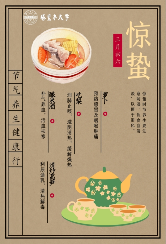 惊蛰后,天气将明显变暖,清淡的食物有助于自身的新陈代谢,因此,推荐同学们多食一些春笋,萝卜等对肠胃蠕动有很好效果的粗纤维蔬菜。