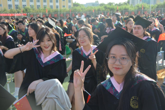 毕业生们身着毕业服,头戴毕业帽,有的整齐列队,有的成群结队,有的三三两两,大家都面带微笑,心情愉悦,信心十足,满怀期待,迎着飘扬的彩旗,陆续穿过毕业门,走进绿茵操场,迎接属于他们的大学最后一课——毕业典礼。