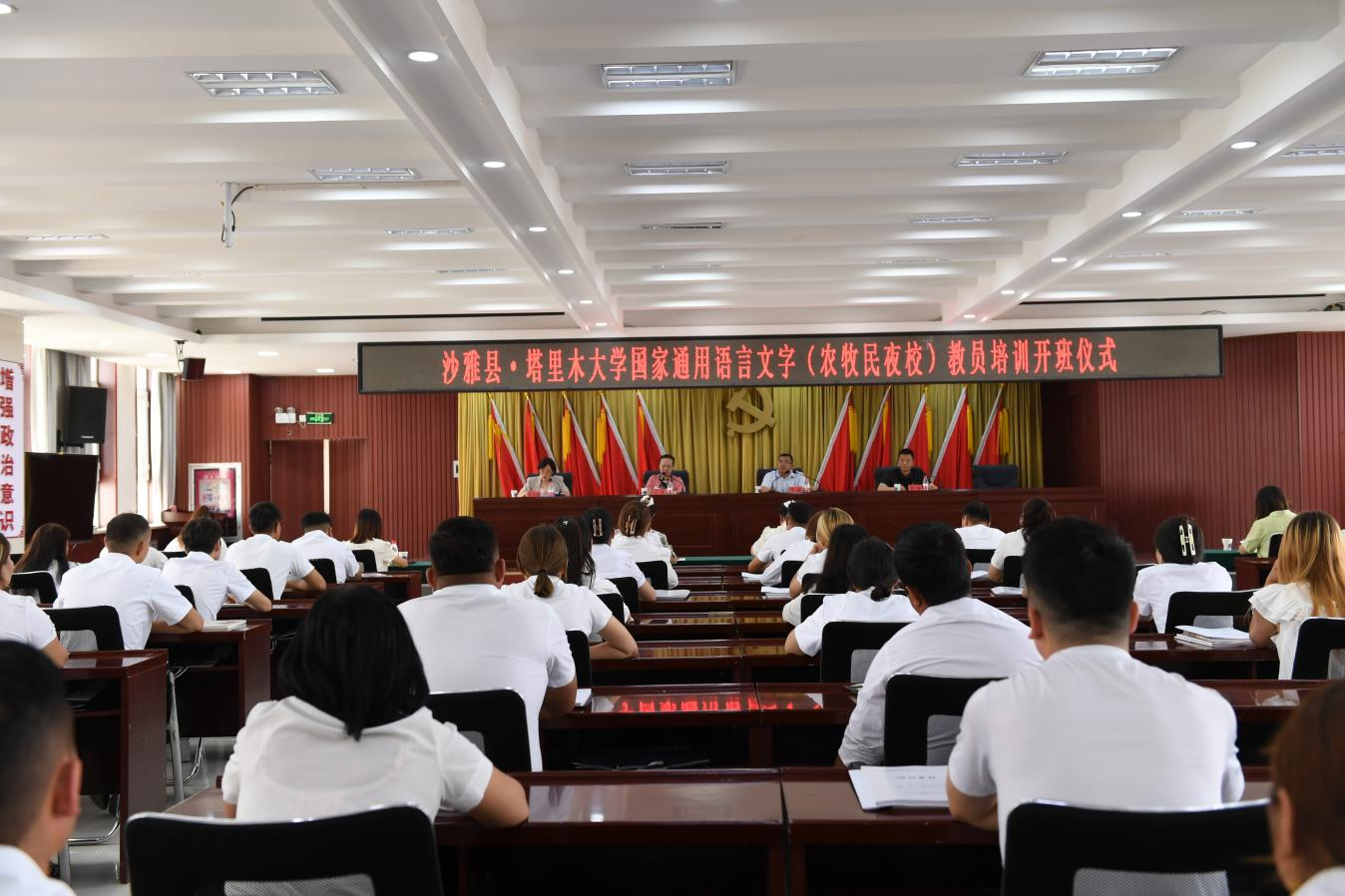 6月19日下午,沙雅县·塔里木大学国家通用语言文字(农牧民夜校)教员培训班开班。塔里木大学党委统战部部长张磊、人文学院院长肖涛,沙雅县县委常委、组织部部长袁峰,沙雅县县委党校副校长李洁霞出席会议。100名沙雅县基层乡镇干部(农牧民夜校教员)参加。袁峰主持开班式,在沙雅县县委党校报告厅举行。
