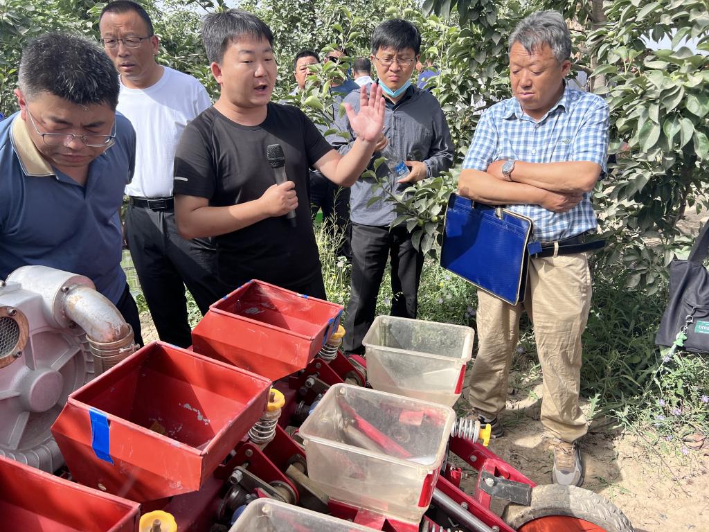 演示现场,小院成员赵劲飞、冶瑞分别就果园行间粉碎掩埋一体机和气吸式果园绿肥混合播种机的技术参数、适用场所、使用现状、操作要领及性能保养等方面向大家详细讲解,大家驻足围观并积极讨论,为机具的示范推广及更新迭代提供了宝贵意见。