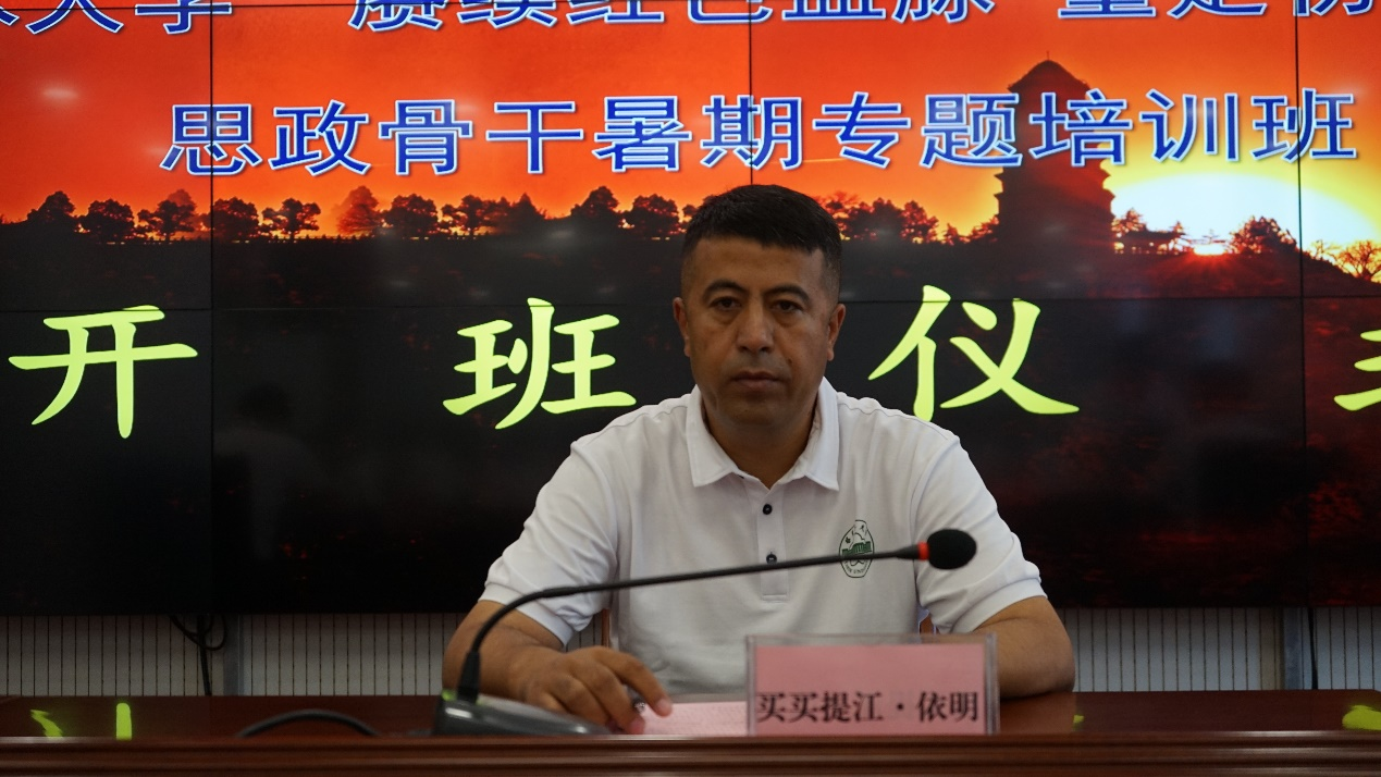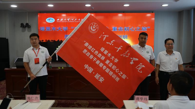 开班仪式在嘹亮、庄严的国歌声中拉开序幕。延安大学泽东干部学院副院长郭东军致欢迎辞,并介绍了学院的基本情况和本次培训班的课程安排。接着党委学生工作部副部长买买提江·依明做动员讲话,并对全体学员从提高思想认识、严肃培训纪律、做好多方配合三个方面提出要求。他勉励学员们要立足本职岗位,深入学习、充分领会延安精神,最后郭东军副院长为培训班代表授旗。