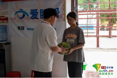 图为村里的中学生受其奶奶嘱托前来送西瓜。中国青年网通讯员 张国庆 刘枭 摄