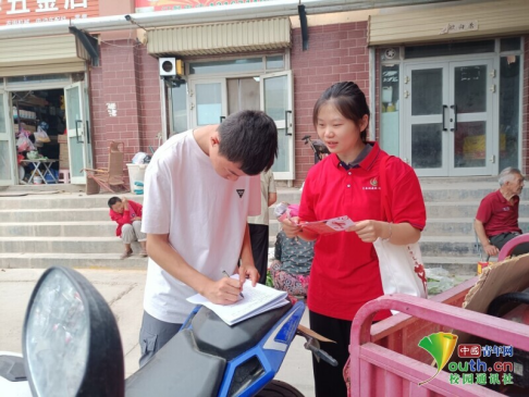 图为实践团成员发放宣传手册,并邀请青少年填写问卷。中国青年网通讯员 肖霖钧 摄