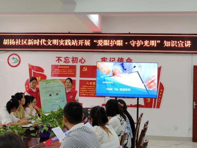 图为实践队员向社区居民宣讲爱眼护眼知识的画面。