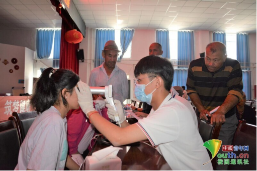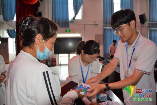 图为实践队员给团场居民发放药品的画面。中国青年网通讯员屈越供图