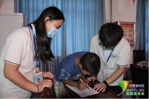 图为实践队员指导小朋友填调查问卷的画面。中国青年网通讯员屈越供图