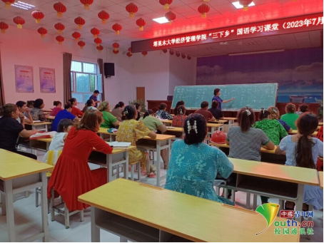 图为小队成员帮助村民学习国语。中国青年网通讯员温菁楠摄